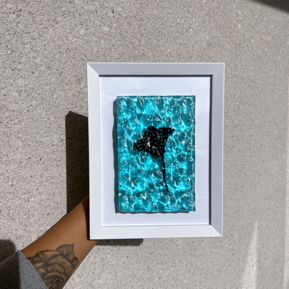 Though subtle in form, each ripple in Mini Ripples holds incredible depth - a soft dance of blue that captures the ocean’s quiet grace. 3D Eagle Ray captures a quiet moment beneath the surface - where light dances through Turquoise water and the rays glides effortlessly through it. Handcrafted with epoxy resin on a sturdy base and framed in white, this artwork brings an elegant, coastal serenity to any space."
